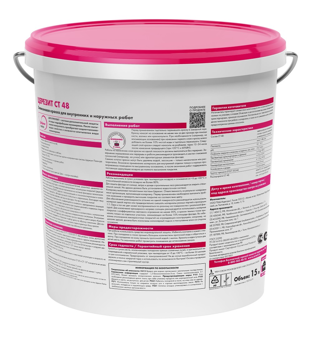 Описание товара: "Краска силиконовая Ceresit СТ 48 водно-дисперсионная база (15л)"