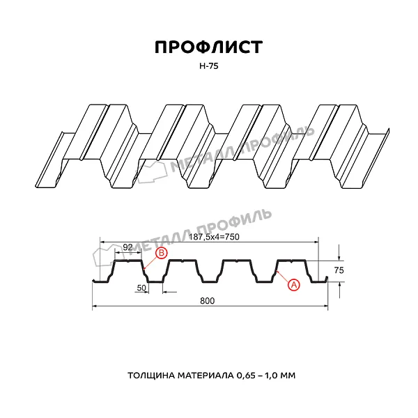Профлист МЕТАЛЛ ПРОФИЛЬ Н-75x750-B (ПЭ-01-7004-0,8) часто используется для монтажа профилированного листа. Представляет собой стальной оцинкованный лист с покрытием. Толщина металла с цинковым и полимерным покрытием — 0.8 мм. После проката на специальном оборудовании металл приобретает рисунок из ритмичных волн. Несущая способность такого листа на порядок выше плоского.